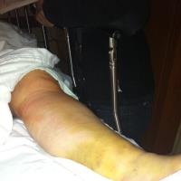 Ok, fair warning, this is going to be a long post full of nasty pictures. I want everything in one place. So if you aren't up for it, hit that red x in the upper right corner. So on Friday feb 8th, I stopped at the Hardees in Morton to get the free breakfast sandwich they owed me for messing mine up twice a few months earlier. I decide it will be easier to explain if i just go in. Thinking I will just run in, I left my phone in the car, step out of my car with my right foot and slip on a patch of black ice. I go to drag my left leg around as its twisted behind me and immediately notice that my foot is dangling. ummmm, not good. i can't get up, nobody around, phone not in reach. wait a few minutes, car pulls through drive thru and i flag him down and ask him to go in the store to get an employee. i seriously thought he was not going to do it. anyway, guy comes out, looks at me, says he has to get manager. he comes back out and says she is starting paperwork and says he is going to help me get up and back in my car. i tell him there is no way i am going to be able to help lift myself as im still on ice and cant put any weight on the left leg. he picks me up, i end up putting pressure on both legs to get back in my car. the manager comes out and proceeds to stand there and fill out paperwork with me in extreme pain and in the freezing cold. she asks where i am going, (no offer to call ambulance) and i say i guess i will drive down to the medpoint. i call medpoint to tell them to meet me outside with a wheelchair. the nurse comes out looks at my leg and says we aren't moving you, we are calling an ambulance. so they call an ambulance, dr comes out and agrees and they stay with me until ambulance gets there. apparently they were afraid i was about to pass out, my bp was thru the roof. the ambulance gets there, splints me in my car and puts me on a stretcher. of course i refused their pain meds because they were iv and amy wasn't there to hold my hand :)chad and amy meet me at the er where they gave me pain meds, did xrays, splinted me, and just kept me for who knows how long. i go home with a referral for ortho and sleep as much as i can. kenz had a gymnastics meet the next day that she was super excited about so chad and court went to that while mom and dan came to "babysit" me. the funny part look what mom did the night before. awesomeness runs in the family, what can i say. So we had an appt on Monday and an appt on Thursday where we scheduled surgery for the next day. Unfortunately when I got there and all prepped, my Dr came in and said it was still too swollen, they would put an external fixator on and hope that swelling was down enough to do surgery next week. First, presurgery even though it was just a quick surgery, my pain was through the roof and I ended up being admitted for 2 days. here's a pic of the external fixator in the hospital at home, finally, on sunday we headed back to the dr on Tuesday for him to evaluate the swelling and decided he would do the surgery the next day (Wed 2/20) surgery was scheduled for the afternoon until they called about 8 am and asked if i could come in right away, they had some cancellations. chad convinced me and we all (chad, amy, and I) headed that way. we got all checked in and prepped and then waited a couple hours to go back. I just remember waking up in recovery and being told i was "eating them (drugs)alive" as long as i was still breathing and in pain, keep giving me painkillers. here's a look at my new hardware 15 screws and 3 plates. I guess one leg was worse and one better than they thought. Once my pain was under control, we were on our merry way. i came home and felt pretty good after 2 days and was ready to go back to work, i thought. unfortunately, my body had a pretty bad reaction with the strong ab from surgery and it eliminated all the "good bacteria". it's really hard to recover and have any energy when you can't eat/digest anything. I'm still recovering from that. slowly but surely. Yesterday I had my splint off, staples out, more xrays, and a pink cast on (per Kenz's request). these next ones are pretty bad.... so that's where we are in this journey, the cast for 4 weeks and then evaluating how much longer before i can begin to bear some weight on it. so, i think the worst parts are over, now it's just making adjustments to life and doing as the dr says!